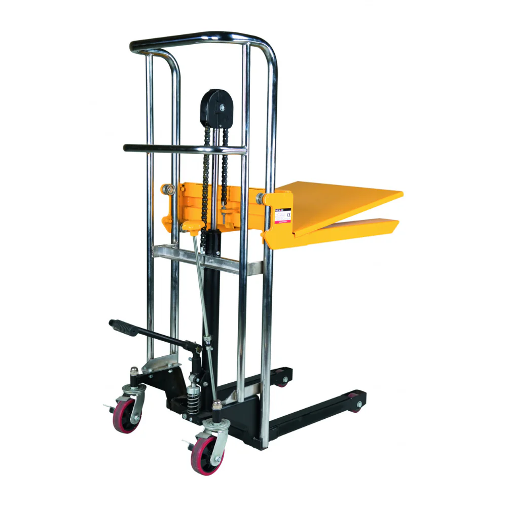 Ce gerbeur est doté d’une plateforme amovible de 650 x 550 mm, idéale pour supporter une grande variété de charges comme des caisses, bacs ou cartons. Son mât télescopique hydraulique mobile permet un levage précis et sécurisé jusqu’à une hauteur maximale de 1500 mm, offrant une grande flexibilité pour s’adapter à vos besoins spécifiques.