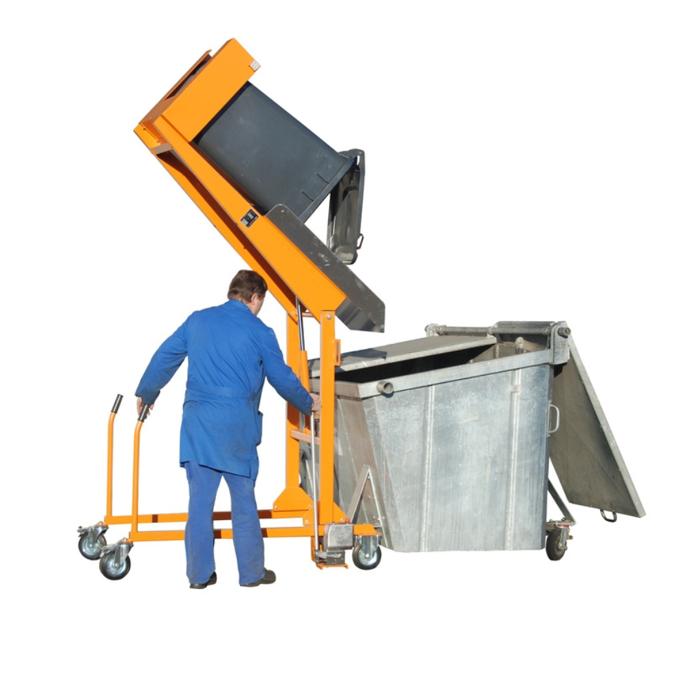 Avec des dimensions de 1570 x 980 x 1720 mm, ce basculeur s’intègre facilement dans tous types d’environnements professionnels, qu’il s’agisse d’ateliers, d’entrepôts ou de zones de collecte. Sa capacité de charge maximale de 110 kg assure une prise en charge sécurisée des poubelles pleines, évitant tout risque de chute ou d’accident lors du déversement.