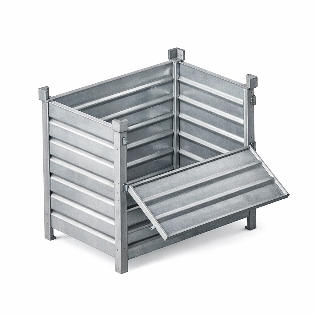 CIVECO vous propose la Caisse Palette Métallique sur Pieds avec Demi-Porte Ouvrable Rabattable CIVCDL1, une solution robuste et pratique pour le stockage industriel.